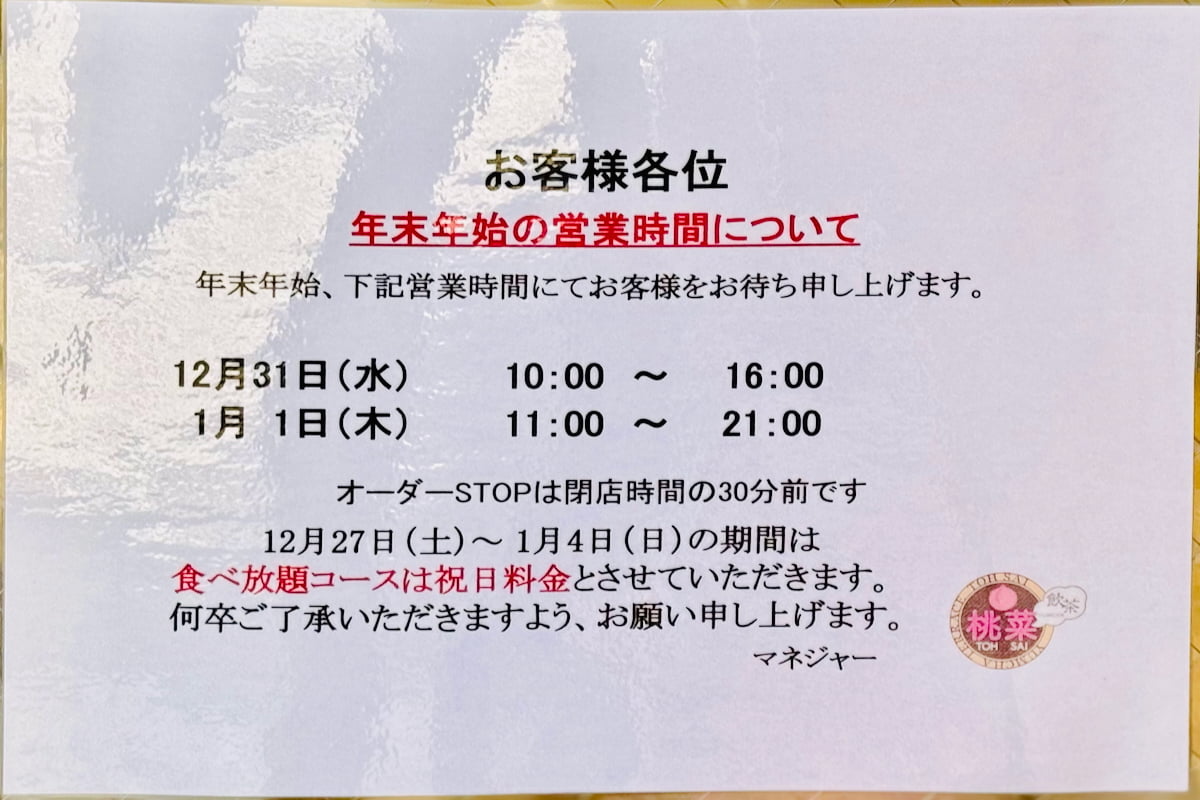 なお「桃菜(とうさい)多摩センター駅前店」さんは、年末年始もご覧の時間帯(12/31(水)は16時閉店、1/1(木祝)は11時~21時まで)で営業されるそうですので、閉店前に食べに行ってみてはいかがでしょう(※12/27(土)〜1/4(日)までの食べ放題コースは祝日料金)。