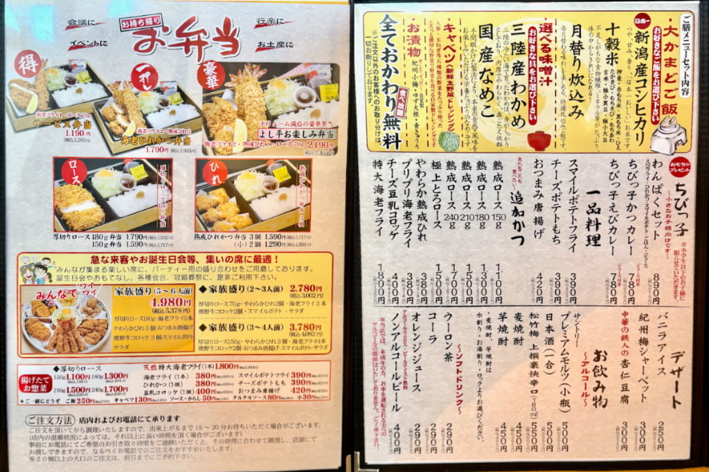 メニューはこちら。看板商品の「熟成ロースかつ膳」をはじめ、「熟成ひれ」や「味噌かつ」「おろしかつ」、少し控えめな「レディース膳」など多彩なとんかつメニューが楽しめます。中には300gのロースかつといった特大サイズも用意されています