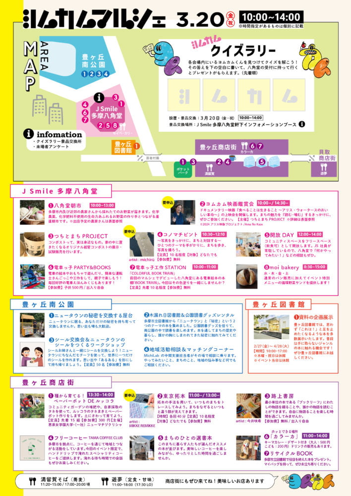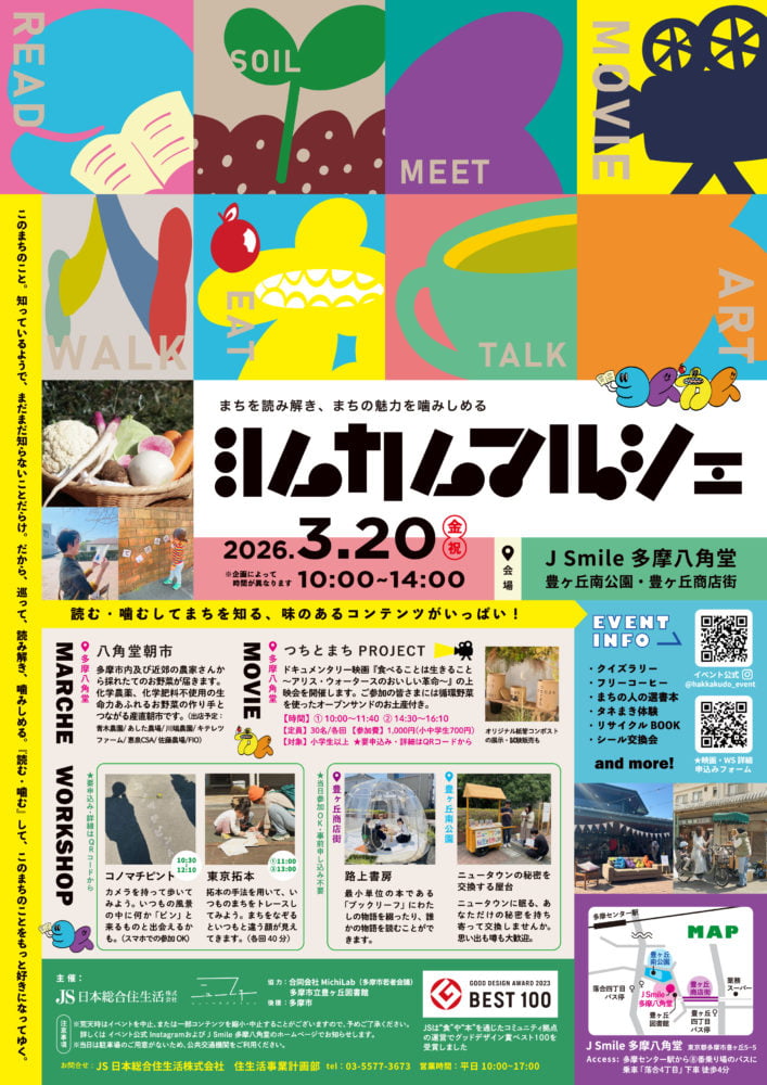 多摩市豊ヶ丘にあるJ Smile 多摩八角堂、豊ヶ丘南公園、豊ヶ丘商店街などを会場に、まちの魅力を「読む」「噛む」という視点で体験するイベント「ヨムカムマルシェ2026」が、2026年3月20日(金・祝)に開催されます。