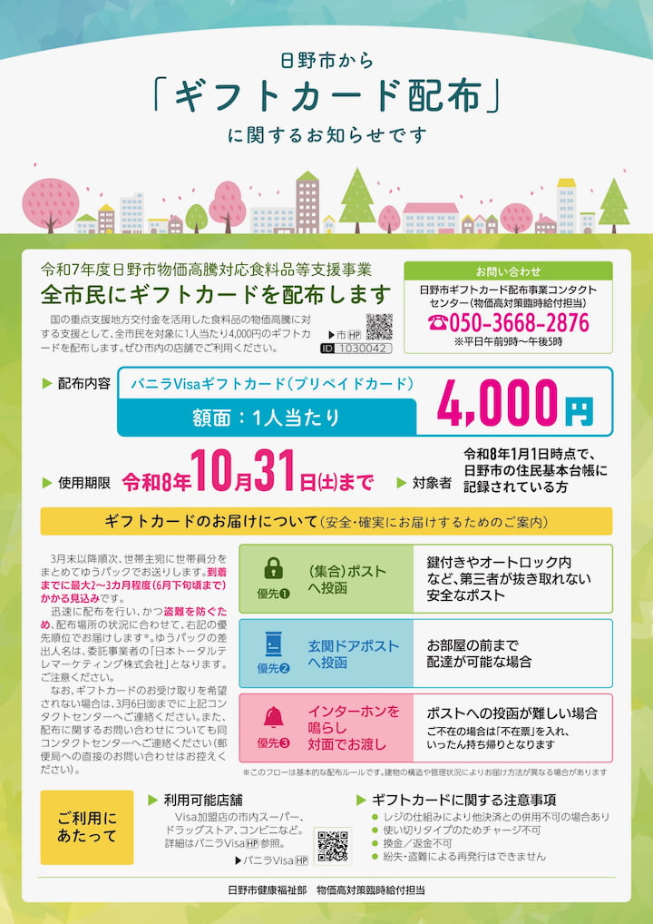 3月末より順次、全市民に4,000円分のギフトカードを配布します|日野市公式ホームページ